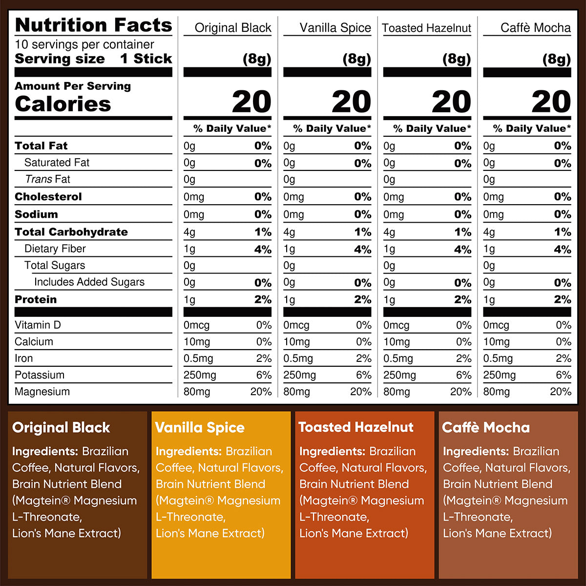 Meet the brews that started it all. Our Original Variety includes 40 instant coffee stick packs in four fan-favorite flavors: 10 Original Black, 10 Toasted Hazelnut, 10 Vanilla Spice, and 10 Caffè Mocha. Whether you're at home or on the go, each stick delivers bold flavor and smooth energy—no coffee shop required.
